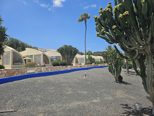 Кратко: маленький немолодой отель со всеми вытекающими (но мебель явно обновленная), состоящий только из сьютов, расположенных в одноэтажных постройках интересной архитектуры, каждый со своим двориком и обширной террасой. Отель находится на второй дальней линии от океана, уровень комфорта сьютов высокий, уровень сервиса в отеле – достаточный, Интернет и завтраки очень плохие. Тем не менее, если мы опять соберемся на Фуэртовентуру, то скорее всего остановимся опять здесь, поскольку комфорт проживания для нас важнее завтраков, а Интернет здесь плохой везде. ||||Нельзя не учесть, что этот отель рекомендован как минимум двумя самыми распространенными путеводителями. «Дорлинг Киндерсли» 2003 года выпуска упомянул его среди двух отобранных отелей в Коста Кальма, назвав роскошным «на живописном склоне с великолепно оформленными номерами прямо внутри скалы», взятое в кавычки, видимо, попало в описание по ошибке из описания какого-то другого отеля, склон, конечно, какой-то имеется, но назвать его живописным затруднительно, а номеров внутри скалы не видели. «Полиглот» 2001/2002 года выпуска, упоминает его тоже в числе всего двух на пляжах Сотавенто, назвав его «экстравагантным комплексом бунгало». Кстати, это единственный отель, на котором мнения обоих путеводителей сошлись (вторые отели у справочников разные). ||||Теперь с подробностями. ||||Отель находится на второй дальней линии от океана, поскольку первая линия довольно широкая. Часть домиков расположена за отелем, стоящим на первой линии, часть – за пустырем, по которому и надо идти к морю. Идти удобнее по грунтовой дороге (там меньше камней), где регулярно пылят встречные или обгоняющие вас машины: у спуска к пляжу устроена дикая парковка. От нее к пляжу надо спускаться, берег высокий. Пляж маленький и симпатичный, половина людей загорала голышом. Нам близость моря была не важна. ||||В отеле есть парковка, машин было много, но место находилось всегда. На ресепшн лежали яблоки, которые можно было брать при желании, это лучше, чем конфеты. При вселении нам предложили по бокалу игристого вина в качестве приветствия. ||||В отеле 51 номер, находятся в одноэтажных строениях, примыкающих друг к другу, группируются в три линии по 17 номеров каждый, лучами расходясь от ресепшн. Один луч одинокий, номера комнат начинаются на 1, со стороны террас вдоль него идет прогулочная дорожка, что уменьшает ощущение приватности. Второй ряд с номерами комнат, начинающимися на 2, идет в противоположном направлении первой линией отеля от моря, вдоль террас его домиков тоже проходит прогулочная дорожка. Чем больше номер комнаты здесь (от 201 до 217) – тем больше степень приватности, они меньше проглядываются от общих территорий. Третий ряд с номерами бунгал, начинающимися на 3, идет за вторым, повыше, при этом постепенно от него удаляясь, т.е. чем больше номер комнаты (от 301 до 317), тем дальше расположены домики второго ряда. №№ 217 и 317, судя по плану, сдвоенные или расширенные. Мы жили в третьем ряду, сначала в № 316, он предпоследний в ряду, был расположен довольно далеко от предыдущего ряда, с террасы мы видели только невысокие купола, не близко. ||||Мы выехали 7 апреля, а 3-го в 8 утра меня разбудил громкий стук почти над головой. Оказалось, это ремонтируют соседний номер, 317-й (заглянули – там патио намного просторнее нашего). После завтра