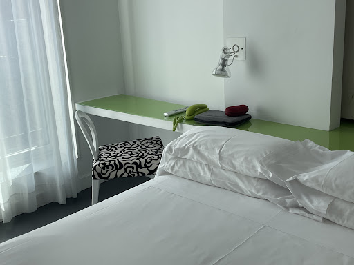 Stayed one night in the Moure hotel which was a most surprising place. I gathered from reviews and website it was of a modern minimalistic style but did not realise it was actually more industrial in style! The entrance is all bare concrete floors with a separate block as a step in one area and does not have a reception area as such just a tiny little office. However the warm welcome from the very friendly and helpful girl in the office put us at our ease immediately. Our double room was at the front, the doors to the rooms are bare prison like steel and the room was very sparsely furnished with a sliding panel on the wall housing an alcove with a few metal hangers for storage. In fairness pictures from website are very much curated and although everywhere is spotless they are not as comfortable as pictures suggest. I had read about the glass panel into the bathroom but the extent to which the occupant is on show was most alarming with the door into the bathroom also acting as the door to the shower and another glass panel to the side of the bedroom looking into the bathroom also! So don't stay here unless you are very well acquainted with your room mate! There was also a lot of noise within the building from other rooms as the partitioning walls seemed quite thin. The breakfast was mostly self service with one of the lovely staff serving if you needed toast or your crossiant heated. The selection was small but lovely with the most delicious brownies on offer. There was also a coffee machine which guests could use at any time which had excellent hot chocolate also, a very nice touch. Breakfast area is small with again spartan furnishing. In all just a step above hostel accommodation but with excellent...