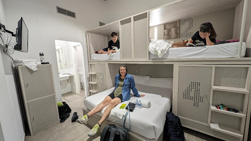 Pluses: great mattress and pillows, decent bathroom, clean and we had a small balcony. There were two large draws under the bunk bed for folded clothing etc, and two large lockers for our bags. The location is excellent.