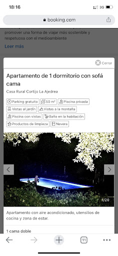 Read morePongo una estrella porque no se puede poner 0. Para empezar la limpieza de los apartamentos deja mucho que desear (los trabajadores no llevaban mascarilla ni guantes para limpiar) , por no hablar del mal estado del mobiliario, entre ello un sofá cama en el que no se podía dormir porque estaba partido. La piscina era una vergüenza, el agua estaba muy mal cuidada, con mucho insectos (algo normal porque está en la Sierra, pero se notaba que estaban acumulados de días y días sin limpieza) además, el agua tenía algas, algo anti higiénico y en la que daba asco bañarse. No lo recomiendo para nada para gente joven, puesto que no se puede hacer nada de ruido a partir de las 12. La descripción de los apartamentos y de la zona es totalmente engañosa, nos dijeron que no íbamos a molestar a nadie ni que nadie nos molestaría a nosotros, pero no ha sido así, se han aprovechado de nosotros, tanto en precio como en actitud. El trato con el cliente ha dejado mucho que desear. Por último, hemos pedido la hoja de reclamaciones y, tras media hora esperando hemos decidido abandonar la estancia, pues no podíamos quedarnos más tiempo. En resumen, un desastre, no volvería a ir ni aunque fuera la última estancia...