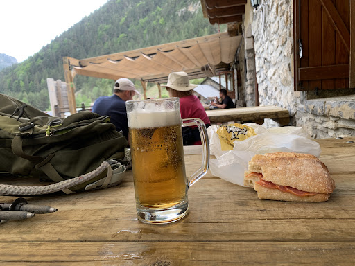 Read moreNo es una reseña como refugio, ya que solo subimos a comer, previa reserva. En la terraza porque dentro no se admiten animales e ibámos con un perro. Nada más entrar y exponer la situación uno de los camareros con un tono bastante chulesco me dice "No se toman reservas para la terraza, tendréis que esperar a que se quede libre una mesa". Le indico que ese no es problema, ya tenemos una mesa. Que queremos pedir la carta y algo de beber. Lo primero de todo que la carta que exponen en su web tiene muchas más cosas que la que me dieron a mi en papel. En concreto carnes a la brasa (me daba igual chuletón, que entrecotte, que ternasco). Y de lo poco que había para elegir no quedaban bravas. Entiendo que un refugio no es un restaurante, he estado en muchos refugios en todos los valles del Pirineo Aragonés y Navarro, pero si pones una carta online, luego no la cambies in situ. Pedimos bebida en la barra y cuando le indico que queremos tomar unas migas y un chuletón, el camarero de la barra, muy amable me dice que lo va a consultar. Le pregunta al chico que antes me había dado una mala contestación y me dice que chuletón en la terraza imposible porque sale en un planto caliente y cada uno se lo va haciendo y que si queremos dentro tenemos nuestra mesa, pero fuera no se puede. Pues no se puede, cambiamos el menú. Mientras estaba esperando para pedir, entró un señor le pasó lo mismo con chuletones, que los quería en la terraza. Entiendo que es su política pero no sería el primer sitio, ni el segundo, ni el tercero que tomo un chuletón en una terraza en el Pirineo. También en ese momento presencié una situación de un chico que venía solo con su perro y entró y desde la puerta intentó pedir un refresco, el mismo camarero le dijo, aquí no se admiten perros, así que el chico le dijo que venía solo y fuera se prohibe dejarlos atados. El camareró le contestó: "Eso no lo podemos gestionar nosotros". Que tendrá razón, pero el trato al público por parte de este chico no me parece normal. El chico que estaba en la barra, muy amable, incluso nos puso unas aceitunas para picar sin conste alguno. Finalmente tomamos las migas y longaniza a la brasa, la comida buenísima. El precio caro para la ración que es, barato para estar en un refugio y en el entorno que está. Creo que es un precio justo. Resumen: Ubicación fantástico, Organización regular tirando a mal, Servicio: Algunos muy amables y otros no tanto. Si puedo evitarlo sería un sitio que mientras estén allí ciertas personas y tenga esa...