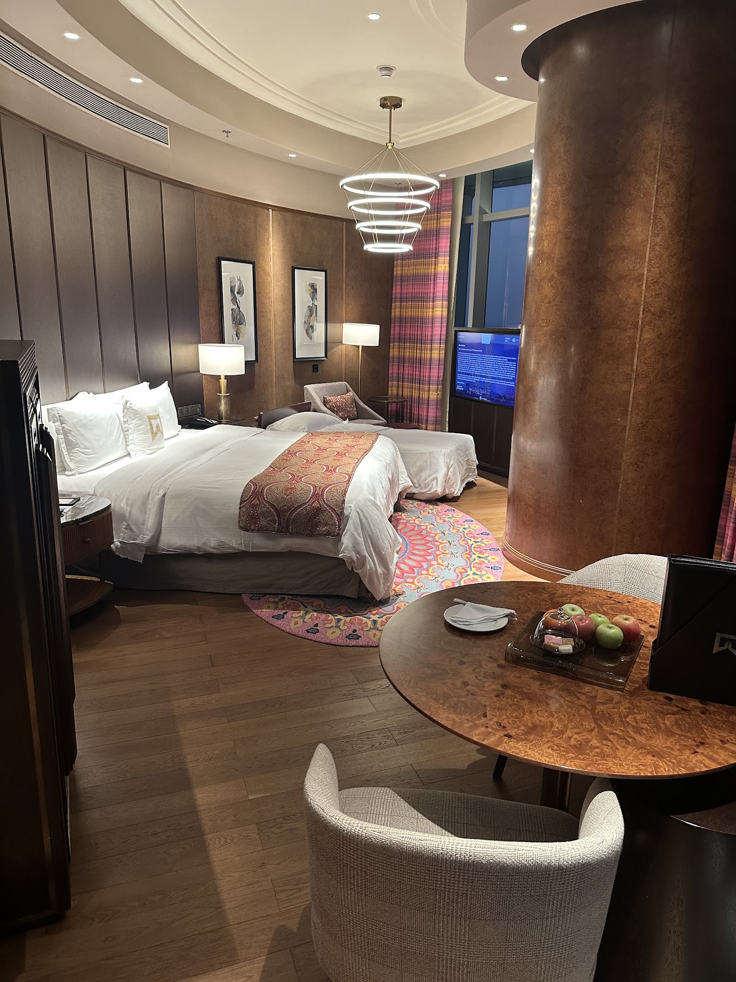 ITC ONE WATERFRONT ROOM: this is the second category room on offer, priced only a little bit higher than the entry level Towers room in either cash or points terms. It definitely didnāt feel like a second category room however, with an advertised 70m of space and a funky curved design due to its corner location. The two highlights of the room were the opulent bathroom and the sprawling wraparound balcony which included ocean views on one side and city views on the other. There was a lot of tech in the room such as electric drapes and a full iPad controller which included room service, lighting, etc. On the whole the room felt very high-end and luxurious, and I donāt think there is any other hotel in Colombo on the same level. It was easily a couple of notches above the Shangri-La hotel next door which I have stayed in previously.