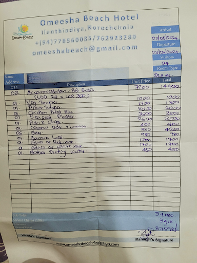 Upon leaving that place, we arrived in Negombo and were shocked to see how inexpensive everything was compared to OMEESHA. We realized that OMEESHA was an expensive place. It's evident that the lack of tourists contributes to poor service quality, higher prices, and a hostile attitude...