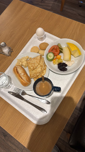 Varje vardagsmorgon serveras frukost 06:30-09:30 och pÄ helgerna 07:00-10:00. HÀr finns nybakade frallor, mörkt bröd, fil och yoghurt eller Àggröra och köttbullar för den som vill ha det. Som gÀst har du alltid, under receptionens öppettider, tillgÄng till kaffe, te och juice.