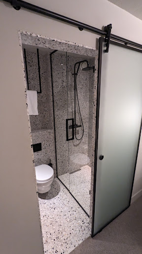 Blique by Nobis wants to be stylish and modern, but it fails at delivering even the mildest standards of a hotel room. The "doors" to the bathroom are just milk glass hanging in front of the doorway and "open and close" by sliding them along a rail. But they are really not easy to slide and in any case don't even really close the bath off of the main room. So I hope you enjoy the sounds of splashing as your partner is doing their business 1.5 meters away from you and barely in privacy as the glass is transparent enough you can enjoy the view.
