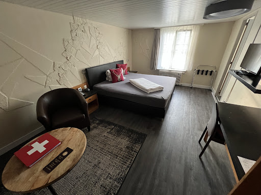 Easy to find. On a main road, but not a particularly noisy one. Has car park. About 15 mins walk from the railway station, less going back downhill to the station! Alternative routes to the station available - one quiet, down leafy back streets & paths, others through the town so handy for enroute shopping. About 100 metres from the stop for buses to the station, & from a Migros store. ||||There are usually taxis waiting at the station - 10 Swiss francs to the hotel.|| ||Sleep quality usually excellent, I would think, but during our stay the weather was exceptionally hot. No air con but room easily ventilated with bedroom and bathroom windows open wide. Bed very comfortable with typical Swiss adjustable head end. || ||Rooms: large, well-appointed, interesting decor. Huge wardrobe, plus other storage. Very spacious bathroom with bath with shower over. The only negative was that the shower head needed some adjustment. || ||All staff very welcoming, friendly & efficient. We felt very well looked after throughout our 7 night stay. || ||Food was good, with generous evening meals as part of our half-board deal. Restaurant closed at weekend, but this gave us the opportunity to sample a couple of Herisau’s restaurants - not that many are open weekend evenings! Not a huge choice of breakfast items, but a more than adequate selection of cereals, cooked meats, cheeses, soft-boiled eggs, etc etc. || ||Good value. Apparently, used most often by business people but no reason why it would not suit tourists, whether singles, couples, friends, families … ||||Public rooms include a gym, a large lounge with comfy sofas, a reading area, a smoking area, & there is a courtyard garden for drinks and meals in good weather.|| ||Cleanliness: could not fault it once I had realised that some of the dark bedroom furniture was made of a speckily material and was not...