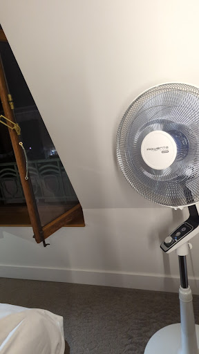 Read moreAnother horribly hot hotel…fan provided to blow the hot air and noise to keep you awake at night. you can’t leave your window open at night unless you don’t want to use the shade to block out the night lights from across your courtyard. The shade is on a control that only allows shut or open nothing in between. One towel for bath and one for hand. But don’t ask for any more downstairs because they won’t have any. There’s a hot comforter in the room with an option of a sheet that’s in a drawer, but there wasn’t. Another trip downstairs to ask for one. The office is open only until 10pm…so hopefully something doesn’t breakdown in the night. No plug outlets by the bed Just old iPad inserts that don’t fit the new phones or iPad. Because there’s no air conditioning, and the bathroom has an odd configuration, it gets no air flow into it at all. Permanent hot box. I did ask if there was another room, but was told they are always full! Who would want to stay here? I’m forced to because it’s a Rick Steve’s tour…. No hand lotion, but on the plus side there’s a fridge and hot water kettle. The bed seems comfortable enough but in the heat...