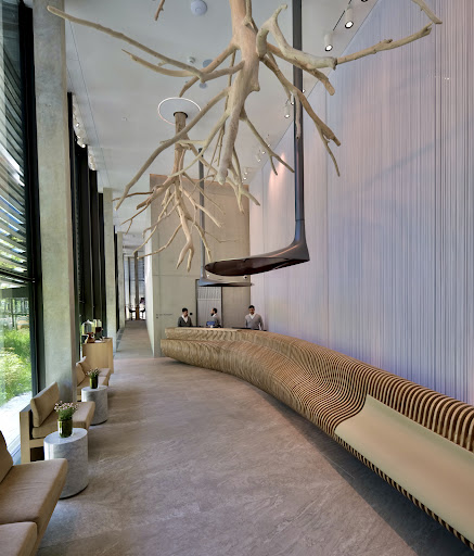 Andre, possibly the general manager, whose passion and knowledge about the hotel's design intricacies made all the difference. The hotel's design elements are deeply rooted in the designer's childhood memories and a profound respect for nature. From the reception desk, inspired by fossil shells, to the chandeliers mimicking the reflection of an upside-down lake, every detail told a story far richer than I had initially perceived.