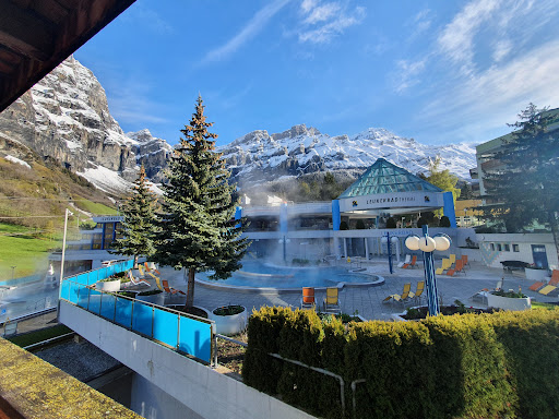 Read moreThis is hands down one of the best hotels we have stayed in in Switzerland. It is family run and they take their hospitality work seriously. The reception was warm and efficient--they explained all of the amenities and were super helpful. There is a great deal as you get a card that allows you free transport on the funicular up to the Gemmi lounge (and you can skip the line and go directly to the entry machine) + an armband that allows you direct free access to the public batch (the hotel has a walkway that allows you to go from your room to the baths in bathrobe). They were super attentive and lots of great advice as well as a nice information table with maps and other traditional printed travel aids. The view from the breakfast area and terrace is down the Leukerbad valley and is a sight to see. The breakfast is basic Swiss fare with muesli, fruits, juice, boiled eggs, cold cuts, cheese, crosissants, etc. and solid and just what you want before a day of hiking or the baths or both. The family tag teams the breakfast with some help and offers you coffee and a bread basket with many types of bread. They speak German and English fluently and probably a few other languages as well. It feels more like home in a good way than a hotel. The Hotel was a perfect location and base for hiking around the Gemmi Lodge and bathing at the public baths. Bottom line is that this place takes friendly respectful Swiss hospitality seriously and it showed in every aspect of our stay. Five star stay and we cannot...