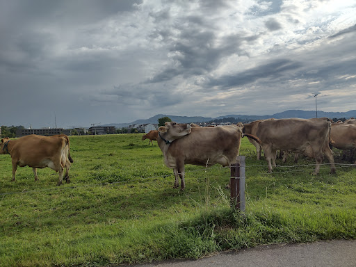 The fact that we were on a road tour and had 4 nights under our belts spent in very nice 3 star pensions probably added to our sense of doom as we arrived at the YH! It looks gloomy and the atmosphere IS gloomy! The room was a basic YH type - 2 sets of bunk beds and a sink plus a desk and two wooden chairs . The balcony was unswept in years and had no furniture but did offer a good view across the fields to the lake….and the Church. The Church bell chimed throughout the night which one of our party found very annoying! The bathroom facilities were spotlessly clean and the showers were good – it has to be said that there were not many people staying at the YH which could explain the spotless facilities – also had it been busier, a room opposite the facilities could have been very annoying with constant traffic up and down the corridor. There was only WIFI downstairs in the public areas. When we tried to hang out in the lounge for WIFI the TV was on very loud, showing a soap opera, so we did not stay!||A Plug adaptor was available on request without a deposit which was a nice surprise. This was the only place we stayed at during our 8 night tour where we were expected to pay on arrival rather than departure. I was a little taken aback to have to pay for all 4 beds in our room rather than the 3 I required but paid up as we did not wish to be joined by a stranger! We had ordered the in house three course meal on both evenings of our stay. Had we realised that there was a MacDonalds in the town just a few minutes cycle away we might not have ordered supper….certainly not on the SECOND night! The food was akin to school meals and the portions were small with no seconds on offer. At CHF17.50 per head we felt supper was over- priced. The second evening we ate supper on the patio which was pleasant, although no-one bothered to tell us where to go and we waited outside the dining room for quarter of an hour before someone directed us to dinner! Breakfast buffet was very good, however and made up for some of the disappointment of supper.||We had to pay CHF7 per day to park at the hostel which seemed a little steep for a space in which the neighbouring youths were kicking footballs about in!||Secure cages were provided for cycles but we left ours triple chained to the car rack. Good location in that it was an easy cycle into town or to the bathing area. Tempting pick your own...