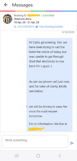 I even tried to reach Saas Fee for the second night, but road access was still closed and some electricity issues persisted throughout the area, making it unsafe to travel. I called again to explain, hoping for at least a goodwill gesture. The person on the phone was dismissive and unempathetic, telling me I should have purchased insurance, and that they were “also losing money.”