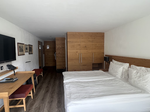 We chose a room with Matterhorn view and that's exactly what we got, it was beautiful! The first night the moon was shining on the Matterhorn and it just looked amazing. There was a smallish balcony with 2 chairs and a table where we sat and had drinks sometimes. The room is ample sized with great amenities: microwave, hob (didn't use either), fridge with ice box, kettle, DeLonghi coffee maker with 2 pods provided everyday, cutlery, plates, glasses, cups, bottle openers, hairdryer, all-in-one hair/body wash. Really appreciated that a sponge and washing-up liquid was provided, also tissues. There is an offer to fill the fridge with drinks, but Denner supermarket is just across the road, which was very handy! The room was well insulated, didn't hear anything from anyone when inside.There is a lift or stairs for use. Ski room in the basement is great, though the locker is quite tight for ski boots, poles, skis and helmets (x2). Boots hang on a boot-warmer which blows hot air twice a day. The room is easily reached from inside the hotel or (when in ski boots) from a lift outside. Near the ski room is a laundry room with one washing machine and one tumble dryer for free use. Tablets can be bought cheaply from reception. There is also a bike storage area which doubles as a room to play ping-pong. Bats & balls are provided from reception free. Spa area is nice - brine swimming pool which was lovely and warm with various areas with jets. Seperate sauna area (no swim wear allowed) with 2 saunas, a steam room and a foot spa. Linen cloths are provided to sit on or wrap around yourselves. Towels, robes and slippers are provided in the room for use in the spa. Breakfast is a buffet with lots of variety - a hot holder with beans, bacon, sausage & scrabbled eggs; there was a rice cooker and noodles; cereals, fruit, dried fruit, nuts, pancakes, cakes, yogurt, salad items, meat, little pots of different things such as ceviché, juices, coffee machines and a self-serve fresh orange juice press and not forgetting a big chilled cabinet full of different cheeses. Staff are lovely. We were leaving early, so a 'lunch pack' was provided in lieu of having breakfast. For skiing it is about 50m walk to the free e-bus (green line) which will drop you off close to the lifts for the Sunnegga or Matterhorn Paradise ski areas; or about 100m walk to the station for the mountain railway that will take you to the Gornergrat area. Directly opposite this station is the main train station for Zermatt, making for an easy and comfortable transfer from the airport. Overall it was the perfect hotel...
