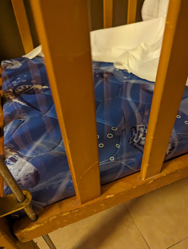 The Sleep Situation The crib had a rock-hard bottom layer wrapped in clear plastic, perhaps as diaper leak protection. It wasn't really a mattress, more like a board, and there was a blanket laid on top to make it softer. Our kid doesn't sleep with blankets, and babies younger than him probably shouldn't be sleeping with blankets to avoid the risk of SIDS. But the bottom layer was too hard to sleep on by itself, and the plastic made the surface unbreathable and uncomfortable. For young babies, this surface could pose a suffocation hazard. It was after seeing this bed that we cut our losses and went home.