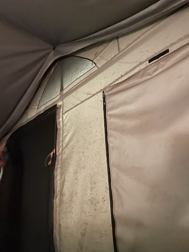 ・帳篷 整個帳篷外觀上佈滿灰塵和髒污,原本以為這樣也在所難免,林林總總小缺陷也先不提,ㄧ踏上帳篷的木板就踩到坑差點摔死(兩個大坑!!沒有修繕還被用踏腳墊遮擋!!),椅子4張裡面1張是壞的還都超髒,濕抹布擦兩遍都是黑的,我們帳忘附電扇,還只能自己去搬…。 進到帳篷內迎面就是一股一言難盡的味道(感覺是煙味+霉味+…)營帳中空調管線上長滿黴沒有處理,營帳內也沒有空氣濾清設備,害沒有呼吸道病史的本人咳整晚被嚇到。 床面、地面看著還算整潔(雖然後來晚上睡一直抓癢不知和床有沒關係),除入口處可放行李的大台面外,只有一小小床頭櫃,而且桌面還有破損未修繕(未圖),帳內照明也十分昏暗,整理東西、收拿行李都不是很方便。