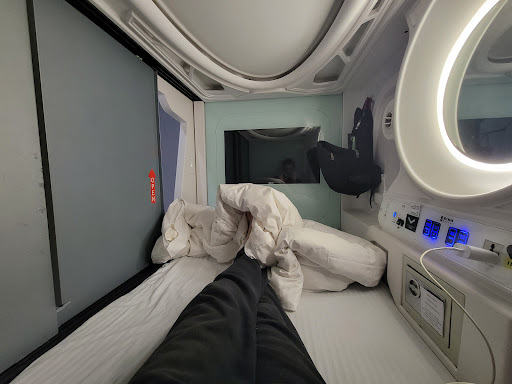 Read moreCool to experience a space pod. Well, sort of... The lighting, the blue light, mirror and overall feel of the capsule makes you feel you are in a space pod. ||||Accommodation is pretty cheap and they reply to queries immediately. Location of the capsule hotel is a 2minute walk from the subway station. It has signage and elevator to the building (i think they have the 8th flr). We have to book 2 days since our flight was early morning. ||||The place is clean and quiet. Like really quiet. The staff are not really friendly, they will answer your concerns and that is it. You be careful not to make any noise. ||||Upon getting off the elevator is the lobby, reception and common area. Here you can eat your food, there are coffee and snacks to be bought or just bring your own food in. You need your card key to get inside the dorm rooms. The locker room area where you can fit mostly hand carry luggages and bags. Bath area has shower, wash area and toilet (Important note: there is no bidet and Toilet paper in the toilet). Toilet are both the squat type and the one with a bowl. Showers are basic, you need to bring your own stuff. They do however have an area where you can fix yourself with mirrors and hair dryer.||||The sleeping rooms are cold and dark. On your pod you can adjust the vent (not the temp since it is centralized), it has socket for usb charging and plugs, mirror, one pillow and futon, a tv with remote, reading light. It has a safety deposit box tho i was not able to use mine. Then pods have secured doors that locks. The lower berth can hear the upper berth when moving. Also, they have a plastic basket that you use to bring your toiletries. ||||Most of the stuff, you provide on your own. Slippers, towels, toiletries. ||||Don't put the card key close to your phone as it can erase the details. If that happens, just ask help at the reception.||||Make sure to checkout exactly 12 as they strict with it. This is what turned me off with it, anyway we were done and just fixing our luggage in the locker room area when the staff went inside to inform us...