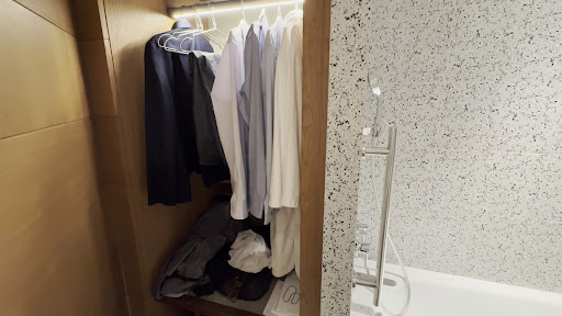 One quirky design feature in the room is the placement of the wardrobe inside the bathroom. Even more unusually, the wardrobe and bathroom share the same door. This means that if you close the door while showering, steam from the shower can accumulate and get absorbed by the clothes inside the wardrobe. To avoid this, it’s advisable to keep the door slightly open during showers.
