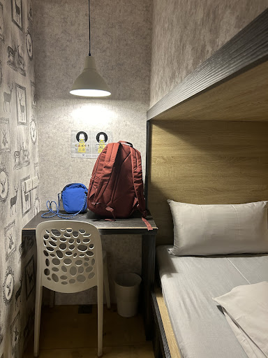 Read moreThough the room is are small, the privacy option is very nice. Individual rooms are creativity constructed with beds located within an alcove, with one above the other. Each bed then has its own separate entrance, desk and door. There is an option for either single mattress or the double sized mattress. The mattress themselves are think at 4 inches, however they are spring mattress and very firm, unlike foam mats which are common l used at other hostels or inns.