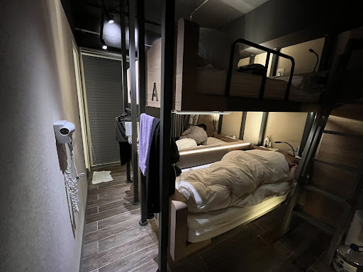 Better than I expected for a hostel/backpack hotel. Several floors are hostel type shared bunk bed rooms with a few private bunk bed rooms for 3-4 people. We stayed in a 4-person bunk bed room and it was surprisingly spacious and very clean. The sheets, blankets, and pillow & cases were provided, you just have to put the sheets and pillow case on yourself. They were very clean. The whole environment in the room was very good and quiet as the door is a very duty door that provided good sound insulation. The 2nd floor is the lobby and could use more cleaning in the seats (under the seat cushions of the arm chairs there were lots of dirt and crumbs etc). The shared spaces are all pretty nice with 2 PCs you can use, lots of dining and hang out areas, and a large kitchen area with breakfast which is just simple bread toasts and several kinds of spreads. There's board games, and even a Nintendo switch which we didn't try, but some nice activities provided. Staff were helpful with questions we had, and when we left the staff with glasses even came up to us and gave us several little rice roll snacks for the kids. Overall, a good place for families and we would stay...