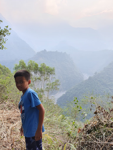 主屋的原住民小弟本來玩手遊玩得正樂,後來帶我們去步道觀景,前面山巒成團,雲霧繚繞,河流蜿蜒形成馬蹄彎,有個部落在對面山腰上。小弟指著那個部落,說他平常沒有客人時就住在那裡。