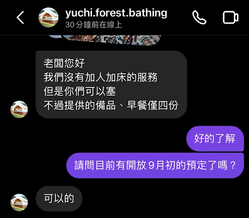 Read more營主回應方式不敢恭維 4/16詢問是否開放9月份預定馬上就回覆說可預訂 結果跟營主詢問一帳最多能睡幾個人 營主回覆多的人不另附被子那些跟其他備品我們覺得很合理可以自己準備 因照片大小看不清是否適合自帶兩個睡墊 詢問營主房間大小是否能夠多塞得下兩個睡墊 營主不回應此問題也不想討論直接回覆:「因為硬塞 硬擠 客廳帳如果受傷 須全額賠償」 好聽到這!我也沒回應這句,隔天4/17早上還是傳了訊息確認要預定,結果直到下午一直沒人回覆⋯ 再問了一次請問有預定成功嗎? 結果營主終於回了:「老闆你好 很抱歉 剛剛幫您確認 9月整個月可能會做整修 目前還不確定...