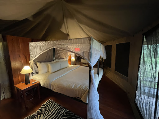 One of the coolest places we’ve ever stayed! From arrival to departure, I don’t know if I’ve ever experienced a warmer, more friendly staff! We were met with welcome drinks and snacks while we checked in and then we were shown our tent. We are a family of 4 (2 adults, 2 kids) and our tent was luxurious! The tents are raised up on platforms and have beautiful wooden floors throughout. The kids each had a single bed and their own bathroom, while the adults had an attached but private room with a king bed and our own bathroom. Beds all had mosquito nets and there was plenty of mineral water for brushing teeth and drinking. There was strong wifi in the tent (which is impressive for being miles away from civilization!) and you could charge all your devices right next to your bed. The food was incredible - we had dinner, breakfast and a box lunch here. Each course is brought out with a silver cover and they teach you how to count to three before you open it together which we thought was fun! Breakfast was a buffet but you could also get eggs and pancakes. For the box lunch we customized what we each wanted and it was all delicious! I feel like every detail was considered at this camp and we so enjoyed our time there. We sat out at the fire after dinner looking at the stars and it was incredible. After dark, we were escorted to our tent by security holding a spear! (All we saw was a dik dik). Overnight you can hear so many animal sounds - it’s indescribable! When we woke up and walked to breakfast we saw animal prints left from the night before - so cool! When we left the whole staff walked us to the car to say goodbye. What an unforgettable experience we had here. Easily my favorite place we stayed during our week...