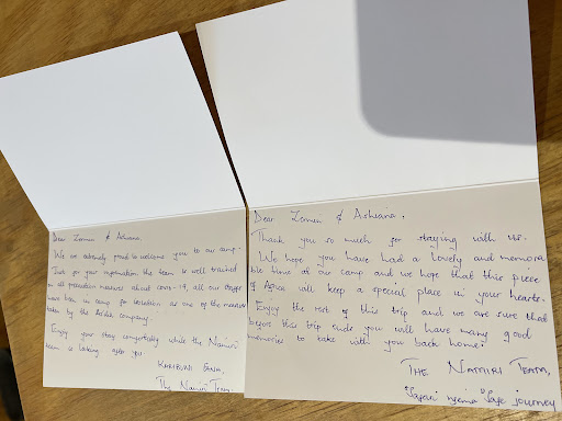 Camp: beautifully decorated, felt like staying at a luxury hotel but with many great eco friendly elements that helped minimize the impact on the environment (no plastic, reusable water bottles, solar power). Beds were comfortable, showers were hot with great views out into the bush. Small touches like blankets at dinner and hot water bottles in beds showed how much the staff anticipated our needs. The setting was fabulous, at most meals we would be looking out over the bush and watching multiple elephants drift through across the water, or see a group of baboons playing in a tree from our back deck. You feel both close to the nature you came to experience but with all the modern comforts of home.