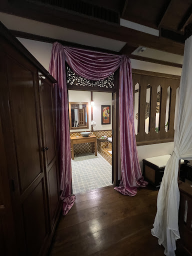 The design feels like traditional Thai with intricate wood carvings, colorful woven textiles, elephants, lotuses, etc. Very beautiful and natural. Not overdone.