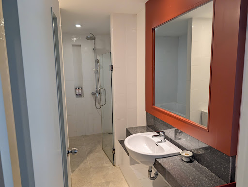 When we arrived, the concierge and staff welcomed us warmly with polite service and smiles. The hotel lobby is spacious and grand, still keeping its classic charm. Our room was upgraded from a deluxe room to a junior suite, with an extra bed added since we were three guests. The room was large and had a front-facing view of the hotel. However, the design was quite old, making the lighting dim, and there were not enough power outlets. The bathroom was small and felt cramped compared to the room size. The bathtub was also small, making it difficult to fully soak, and the water drained too quickly due to a faulty stopper. Despite these minor issues, we had a comfortable stay and were happy with our choice of hotel.