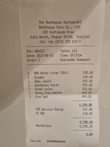 Read moreI don't often write reviews until after I have left but although we are still here I have to tell you about this place as I would have loved to know this before I came The location There is direct access to the beach. Forget rows of sunbeds crammed in, the hotel is on an unspoilt corner of the beach with smooth rocks that attract loads of fish which is great for snorkelling. The beach is also shallow and the sea goes out a long way at low tide causing lovely rockpools. There are 2 bars close by, also on the beach, and often there are fireworks or local fire eating displays on the beach. The street behind the hotel also has shops and restaurants and places you can book trips.This hotel has the best location on kata beach The room. We are staying in 501. These are the ocean suite rooms and have direct access to the pool and beach. I'm not sure on how the other rooms compare but these rooms are beautiful and very handy for the restaurant, pool and beach The food Breakfast - this is included in the price and there is a wide variety of choice and is all you can eat. The staff were always surprised that I ordered very little but unfortunately I'm not a breakfast eater. Dinner- A mixture of western and Thai food. I can highly recommend the spring rolls and yellow curry. The head chef is British but suspect he has some talented Thai chefs in his team as the food is delicious. I thought it was nice that the head chef came out one evening to speak to all the tables. Very conscientious 😊 There is a 400 baht daily voucher for food and beverages but it would be better advertised at the pre charges and pre tax rate as I saw soooo many people question why only 374?? Is taken off the bill and takes the lovely goodwill gesture from the hotel and turns it into a negative if people think that have been cheated. So you won't get 400 baht but remember guys it's still a freebie ok? The staff Can't speak high enough of the staff. They don't seem to expect a tip but are always surprised and smiley when you do and they can't do enough to help you. A special shout out to the pool team who bring towels and cold water and drinks even before you realise you need them 🤣 What would I improve? Some local knowledge and tips displayed on the TV would be good. For example we read on the internet that you shouldn't even clean your teeth with the water. Not sure if that is true or not but would be good to know along with other dos and don'ts. Information such as the ice is made with bottled water would have saved me fishing ice out of my drinks. 🤣 And because my business is business improvement, and I can't help myself, then opportunities to generate revenue by offering trips, advertising the merch in the room rather than just reception. Offering room service at additional cost. Pay per view movies because the TV is so limited, or VPN so guests can watch the channels of choice from their own country. Anyway enough of that. Come to the Boathouse....