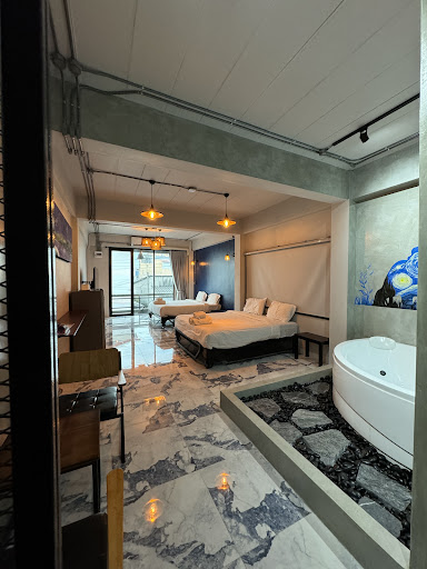 เข้าพักต้นเดือนกันยายน รอบๆเงียบดีค่ะ มีคาเฟ่ข้างๆ มีที่จอดรถอยู่เยื้องๆ เดิน10ก้าวถึงตัวรร. เชคอินไว ไม่มีลิฟต์ ห้องพักกว้าง style loft สะอาดดีค่ะ เห็นแว๊บๆเหมือนขอslippersได้ tvมีnetflix แอร์เย็นฉ่ำ เตียงนิ่มแน่น นอนสบายค่ะ (พักห้องมีอ่างจากุซซี่)
