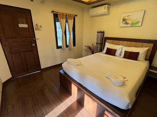 This family-operated resort is in the middle of the jungle therefore the surrounding scenery and nature is fantastic. Big plus for the location. We had our own little house near to the central lobby & restaurant. It was quiet when we were there, I think on the second day we were the only guests. The food was ok though you had to order in advance and not the entire menu was translated to English. The staff did not speak English, so we were lucky to have our Thai guide with us to translate. A couple of remarks:|- The balcony with relaxing chairs and outdoor bath/shower is great, we really came to full relaxation there|- the room is a bit dated and missing some basic things. A decent bath mat for the floor would be nice instead of those brown carpets that are probably not washed in between guests... also we just had 2 towels to shower, none for your hands or face. Also no soap to wash hands and instead of napkins/tissues we were simply provided with more toilet paper. These seem very cheap solutions that could be improved at low cost to give the hotel a bit more allure.|- the sheets had old stains on them, so maybe consider to replace them at some point.. it makes the place feel dirty while it was ok clean|- Our hot water did not work. We reported it in the morning and expected it to be fixed during the day, but in the evening it was still not done. We reported it again at dinner and nothing was done. After dinner we asked the third time, they finally came to check it, concluding after tugging the tap for 10 minutes that the water indeed was not getting warm. Mechanic could not be arranged at 8pm so we asked whether it was possible to shower in the adjacent cottage. We got the key for that and got ready for bed but all of a sudden there was a knock on the door and we were asked to pack our bags and move to the other room all together, which made no sense as we were about to check out early the next morning anyway and it made no sense for them to dirty two beds/rooms. This was a bit strange and embarrassing as we were already in sleep clothes when they came to us. luckily our guide convinced them that we stayed in our original room.|- Apparently it’s normal in Thailand that they check your room while you wait at the desk to check out. We consider this a bit distrustful (maybe a cultural thing, I don’t know) but we are happy they did since we forgot something in the room that they...