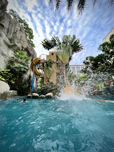 July 28-31 2025. We are return customers over several years. The hotel is great for families with young children. Not overly expensive and not overly crowded. The kids can play all day in the pools and keep busy and usually make friends with other kids. There is a big water slide for big kids (5+) and a slide for younger kids in a safe kids area. The are two ‘cliffs’ to jump off… not sure of the heights but the high one take some guts to jump from. The pool is shallow so a 5 year old can stand throughout most of it. The kids loved it. There is a Water volleyball net and a cool waterfall. In the dry area, kids can play basketball with the hoop and there is a mini football playing area for young kids outside the kids club. There is also an adult pool on the 5th floor. Some faults were that one of two lifts was not working … since July 18 until we left on 31st, 2025. I was told they are replacing it so it may be a while. The Buffet breakfast is a let down… I would give it max 4/10. Omelets were runny and selection was pretty basic. I would like to see better BF, and maybe an omelet/egg station like they used to have back before covid. We skipped BF one day since it is really not impressive in my opinion. Guests are forbidden by the hotel to eat or drink anything in the pool area unless it is bought from the hotel otherwise you can be fined Thb 2000 as per their sign. No chips or peanuts etc as I was told. I think there were too many people taking advantage of this in the past hence the restrictions. Although it’s a non-smoking hotel, we came back after dinner to our room smelling like cigarettes. The hotel came and sprayed the room to remove the scent. Too bad some guests don’t think of others. The food by the pool was quite good … wagyu burgers, pizza and fish and chips. All tasted good, especially the Thai food. One big surprise was the cocktails made by ‘Khun Nongnong’ - she made some really great cocktails… (Thb 250 for 2) I was really impressed. Happy Hour from 5-8pm . I would suggest ask from her only. She knows what she is doing. The room was small but ok. We had a twin and pushed the beds together so had a 7ft bed for me and my 5 and 9 year olds to share. Slept well. Bed was comfy. The TV’s are made by Toshiba I think but have very very low number of pixels. I was watching a football game and could not even find the ball. Completely useless TV and might as well not have one. I suggest they replace them all with smart tv’s so guests can watch their own Netflix, Prime ext. This would be a big improvement. One last note is that I saw some tiles falling out around the pool. I think the pool could use some love and attention. I noted that on the deep end under the cliff jumps was lots of leaves gathered at the bottom… a daily morning clean would make a difference. Service was good at reception and the pool bar. The staff in the Breakfast were not smiling so much and were not ‘on the ball’ in my opinion hence 4 stars average. Location is great with only a short 5 min walk down to the beach with lots of other restaurants to try out. Other than that we really enjoyed our stay and would recommend to our friends with young kids. We...