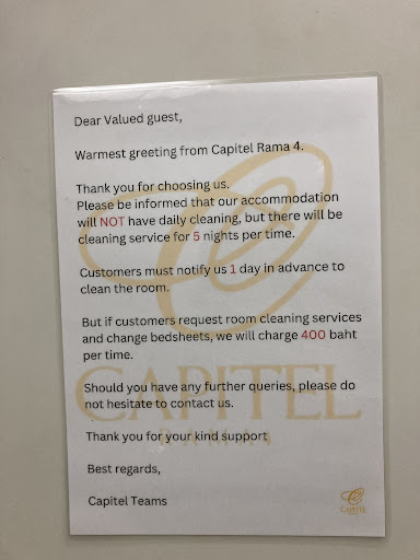 We stayed 4 nights in Capitel, in April 2024, during Songkran. What we liked: the access to a well equipped kitchen, we cooked breakfast every morning (what most people use the kitchen for) and used it also to dine in one evening. the rooftop terrace, especially in the evening when the temperature goes a bit down, it is very enjoyable to sit and have a drink there (there is a big 7/11 nearby with a good choice of beers) comfortable bed