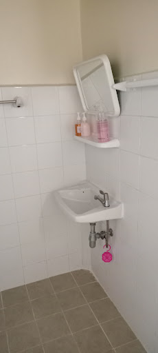 The bed has a firm mattress and light duvet. The work table is next to the bed and is also where the 2 electrical sockets are. A small corridor leads to the bathroom where a wardrobe and shelfs. The bathroom is all tiled with an electric shower unit, while the toilet is standard Thai design. Liquid soap, shampoo and conditioner are also provided. Unfortunately, the bathroom floor wasn't designed to direct the water towards the sinkhole.