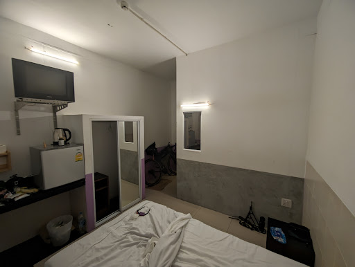It is a strange combination of youth hostel and hotel. It is a hotel, but the room (the single I was in) was dirty. Not like splooge all over the place, don't go barefoot, pay per hour dirty, but the walls were extrememly scuffed from people putting their feet on the walls and from luggage wheeles, there's also ants, some hair floating around that I know isn't mine, the sink, toilette, and shower seem to leak. But some how you can look passed that. On a scale of "gross I won't stay here" to "surgical theatre" it's a "Meh, I've been in worse and survived." The pluses, you do have your own bathroom, unlike a hostel, but if you are 5'9" or taller, be ready to pop a squat so you can shower. The BIG BIG BIG pluses are the free wifi and 24 hour restaurant. The restaurant has point and pick menus. Nice if you don't speak a lick of Thai. And the Wfi seems to be on the ground floor and the eighth. There is also a pool, but that doesn't matter to me. Another bonus is the drying bar outside the room window so you can dry clothes. Seems hokey, but I have utilized it so it is a plus in my book.There is also a shop right by the hotel. Haven't been, but it is there, so that is a plus. Over all, I can say is I have been in worse, but I have definitely have...