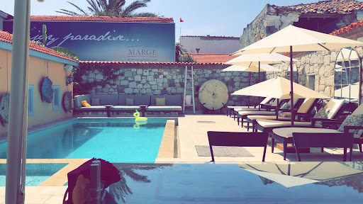 Very unique decor and great location. We had a vintaj room, super colorful. Hotel merged vintaj ||and lounge styles very nicely. Pool is small but has soft couches with pillows to sit in the sun. They use quality amenities of Molton Brown. Hotel is right across the street from the sea, public dolmush runs every 15-20 min, will stop right in front of the hotel and get you to Cesme or Alacati within 10 min. Very friendly managers||Bathroom looks very nice but its completely useless. No hangers, no place to put your razon or shampoo, no way to hang the shower, you have to hold it in your hand all the time while water is pouring al over the place as the bathtub isnt attached to the wall and curtain isnt folding inside the bathtub...also once you close the curtain it becomes superdark, there is no lamp above the bathtub.||Walls are paperthin, wardrobe is very small for 2 people. Walls and floor were shaking so much anytime anyone would walk that i had to put folded paper under the safe box door to stop it from shaking and creating metal noise.||Didnt like the waitress at the breakfast. She was very unfriendly and couldnt care less. To the point that we'd say good morning at breakfast and she wouldnt reply. It was impossible to get her attention so i went all the way to her and asked for a coffee but she wouldnt put her phone away until she was done with it and only then...