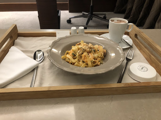 Unfortunately the Club Lounge was closed due to covid, or should I say fortunately? Instead of cutting corners, as a replacement they offered a 4-course full restaurant menu which consisted of far more than junk food; I enjoyed the salmon among other things.