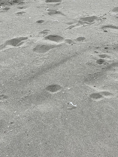 We step on the beach section and the sand is covered in plastic trash and cigarette butts.