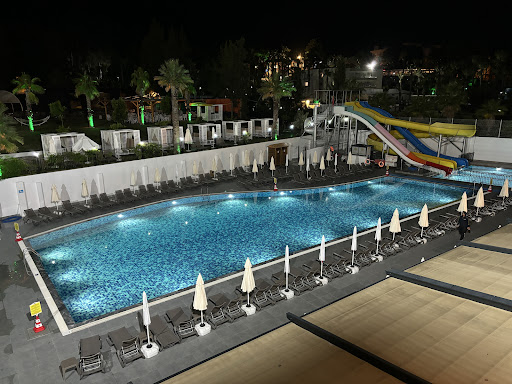 At first sight the hotel seems nice, fresh and luxurious, which partially matches the experience. The hotel offers both a pool and a beach. A big plus is that there is a bus from the hotel that transports you to the beach, where there are sunbeds, food and drinks. The hotel has waterslides that work for children as well as youth and adults. The pool is large and can accommodate many people. Despite this it should be more sunbeds around the pool and also places to sit in the dining room. Because if you dont reserve early (which youre not even allowed to do) then you will be left without a sunbed or a place to sit.
