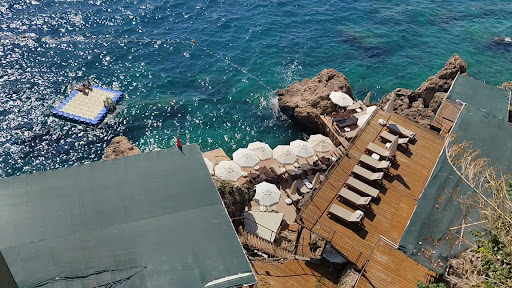 There is no pool here but you don't need it! The sunbathing area is integrated at several levels into the cliff side and there are two areas for direct sea access including a floating platform. I'm usually a 'pool' guy however I must say we had a superb sea side experience here. Plenty of comfortable sun loungers and parasols available including places to eat. We also had lunch there which was excellent quality and quick service. Another thing, the sea is so clear and clean here. It's much calmer in the morning however one can still swim into the later afternoon if you wish. What was also useful (!) is that there is a modern outdoor lift for easy access down to the sea level. The area gets sun most of the day into the evening so is good for sun seekers. We prefer the shade and there were plenty of options for us throughout the day.