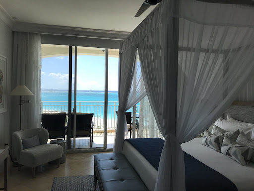 We were thrilled with our sixth floor ocean front junior suite in Alhena (the most eastern building). The four-poster bed with sheer curtains and soft sheets was sinfully comfortable, and the decor was stylish, breezy, and chic. The large marbled bathroom included a washer and dryer in the water closet (of which we were appreciative), a shower, two spacious sinks with plenty of fully stocked cabinet space, L’Occitane bath products, and a large jacuzzi tub (this was such a huge selling point for us)! What took our breath away the view of Grace Bay Beach. We faced slightly west, with the most awe-inspiring sunsets imaginable. The balcony was large and included a table and chairs (perfect for dinner al fresco) and two lounge chairs. Words cannot fully describe the beauty of the water in Grace Bay, and yet photos do not do it justice either. It is something one can only truly enjoy as an experience.