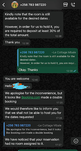 Disorganised! Terrible management of bookings! I reserved a room 2-weeks ago ahead of the Christmas break and was certain I would have a place to stay. Today I received a WhatsApp message asking me to confirm my booking and provided the details (bearing in mind the booking was made via Booking.com so they would have the details). I was told all was confirmed ahead of my stay and that I would need to pay a deposit of 30%. It sounded strange given I had already booked via the Booking.com platform, but I said āokay thanksā waiting for further instructions. 5-hours later I receive a message saying the booking is cancelled and there was a double booking, which I find hard to believe as they had already enquired about my booking and confirmed it only a few hours prior.