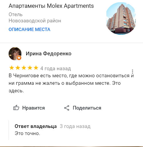 Read moreЭто мошенничество, фото не соответствуют действительности! Повелись на отзывы, теперь понимаю их происхождение - отзывы не настоящие. Хозяйку этой фирмы зовут Ирина Федоренко и вуаля, здесь есть отзыв от Ирины Федоренко: " 5/5 В Чернигове есть место, где можно остановиться и ни грамма не жалеть о выбранном месте. Это здесь." Отзыв даже с ее фото, на фото фирмы и в профиле гугла - она. Так более того, к отзыву есть Ответ владельца: Это точно. Вот так сама себе написала и сама себе ответила)))) Более того, она свои апартаменты оценила не один раз. Следующий раз она писала, что у нее "уютно и комфортно", и она "рекомендует" себя же, вот такая скромняшка Подозреваю, что после моего отзыва она свой удалит, поэтому фото прикрепляю. Также много тех кто оставил отзыв на 5 звезд, у кого это один единственный отзыв. По остальному: в реальности, все не так как на фото, нам было сказало цитирую:, "на фото реклама", "с той квартиры не выселились" и т.п. Общение проходило в хамской манере. Также...