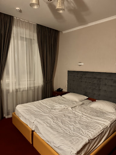 I stayed there just two nights because of my meetings in that part if town, which is called Obolonskyi - Kiev outskirts really. |So I didnt expect much but when I entered my room, I went: "Wow!" Who would've thought! |It's a suite with entry hall, sitting room with fireplaces, and a decent size bedroom. There are two bathrooms each equipped with shower cabin, one of them even has a hydro-massage type of shower - neat! |Bed is quite comfy, pillow cases have Hotel's logo embroiled on them - nice touch!|TV has about a 20 channels only and most of them are national TV... Hm... Missed my BBC and CNN news. ||Everything was too perfect to be true and I couldn't help but looking for the catch. But there is none. All this for 35€/night, breakfast included. Fantastic. ||On the downside: they need to reconsider their breakfast system. In the morning, when people are in a hurry (and I am personally grumpy until my first cup of coffee) it's not a good idea to be seated, choose your breakfast from the menu and wait to be served by the only one staff working there? Set menus offer traditional breakfast choices (e.g. pelmeni - meat dumplings, or chicken broth good for hangover I suppose) but not a normal continental breakfast. I chose pancakes stuffed with cottage cheese, served with fresh cream and cup of coffee. Asked for some jam - nope. A glass of orange juice? Nope, unless you buy a 1 l box of it. Whah? ||The breakfast room is small and dark no windows closet type - see photo. Well, it could've been the catch I was looking for, lol! ||Otherwise - i was pleased with my stay there. Tomorrow moving to another hotel though, as my meetings will go on in another part of this...