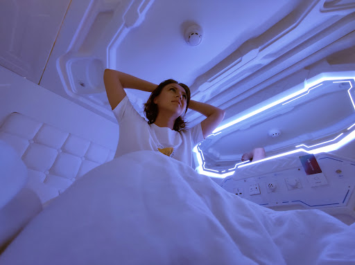 Read moreВыбрали его из-за футуристичности, удобной для нас локации и цены. Прикольно, что у нас есть капсульные отели, не знала. В целом похоже на хостел. Туалеты и душевые общие. Мы были в двухместной капсуле в отдельной комнате с персональным туалетом. В комнате две капсулы. И туалет+душ все же не персональный, а на эти две капсулы. Очень малюсенький. И почему-то без фена и освежителя, как в общем туалете. Т.е. если вы фен с собой не привезли, придется идти с мокрыми волосами сушить в другой туалет. Ещё в вип туалете изнутри отсутствуют наличники на двери - выглядит ужасно. В этой "ВИП" комнатке есть ещё два пуфа и две розетки. Вам выдают по одному полотенцу, беруши, наушники с переходником, пульт и две карточки для входа и от капсулы. Тапки можно купить на ресепшене. Без беруш думаю спать вообще нереально, во всяком случае в трезвом состоянии)) Шумоизоляции практически нет. Там тихо, все соблюдают тишину. Но двери, какие-то движения, все это звуки. Сама капсула "гремучая". Если случайно рукой или ногой дотронуться до потолка или стенки - гремит. Дверь в капсуле закрывается, это плюс. Но тоже довольно громко. В самой капсуле есть две розетки юсб, разный свет, мощность вентилятора, телевизор. Телек естественно только в наушниках. Спать удобно, места достаточно. Но ночью становится душно. Просыпаешься и включаешь сильнее вентилятор/кондёр. Я так и не разобралась кондёр это или нет, спросить забыла. Дует не холодный воздух. Без него дышать конечно будет нечем с закрытой дверью. И вот он всю ночь шумит. Это наверное самый большой минус, что ночью постоянный шум вентилятора и душно. На вторую ночь рано утром открыли окно на улицу в комнатке и дверь в капсуле, запустили свежего воздуха - супер. На ресепшене есть мини-магазинчик всяких симпатичных мелочей. Можно купить безалкогольные напитки, кофе при входе. В распоряжении гостей кувшинный фильтр для воды, чайник, мини-холодильник, немного посуды, сушилка для мокрой одежды, возможно утюг и гладилка по запросу, но точно не знаю, не использовали. Чистота примерно на 4-4 с минусом. Персонал норм. В целом отелю я бы поставила 3-3,5 по удобству, но для нас плюсы перекрыли минусы, и интересно попробовать новое, так что в целом довольны остались. В берушах спать ок. Если б ещё не становилось душно посреди ночи - вообще...
