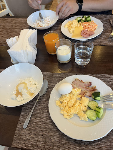 Отличные завтраки, всё стандартно, но на уровне: мясные и сырные нарезки, отличный скрэмбл, каши, сосиски, овощные салаты, выпечка, сок. Чай/кофе делают на баре, очередей нет. Стандартные обеды/ужины тоже есть, но они более консервативные, по этому от них отказались в пользу доставки еды из меню в номер. Отдельно хочется отметить борщ и брускетты.