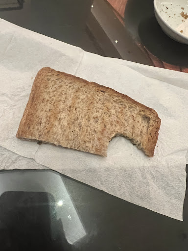 Upon the eventual arrival of my tea, I discovered an unexpected piece of toast nestled within my belongings, inadvertently brought along. Feeling peckish, I indulged in a solitary bite to accompany my tea.