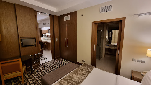 I really enjoyed staying here even though it was only for two nights. Reception was efficient and the staff and security officer treated me with courtesy and respect, the old fashioned way. The building is not in its youth anymore, but thatās not a criticism. The reception area, lifts, corridors and suite are very well looked after and maintained. The room/suite was spotless and very clean with good amenities including a microwave oven, toaster, fridge, washing machine and small built in stove. In fact, itās similar to a serviced apartment. The floor space is ample with separate areas for the kitchen, sitting room, bedroom, bathroom and WC. The air conditioning worked without fault. Separate parking is provided underground. Again, the concierge was most helpful in letting me in and out of the parking. The hotel is well located. Abu Dhabi mall is no more than 4-5 minutes walk away and two pedestrian crossings take you quickly over the roads to the mall. There are several fast food (local) and mid range restaurants around as well as small convenience stores and pharmacies. All this is within easy walking distance. I did not use the gym, but found a local gym only three minutes walk away. I just love these type of local gyms. No Fā¢ā¢ness Fā¢ā¢st hype. The hotel is quiet and peaceful. The reception is quiet and peaceful. The neighbourhood is established with no building work close by. Hence, albeit in the middle of the city, it feels quiet and peaceful! I want to mention that the bed was very good. I slept well and finally I want to thank the staff again. There is pride in your work. No amount of crystal chandeliers and marble staircases...