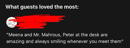 Something about the front desk staff was off.. But nothing have happened until I left.. I saw that I've posted a review on booking and already been approved.. Even though I didn't write any review.. Apparently, on the day that I arrived, I've handed the front staff a printed version of my booking, which had the security code and pin on top.. The issue is, I thought that the security code and pin is used by the hotel staff to confirm the booking.. unfortunately, I realize later that it gave them access to my own account on booking which they used to write a review with full 10 stars and mentioning their names and giving themselves a good review in my name !!!