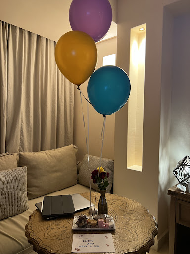 The trip from Abu Dhabi had an unusual amount of traffic congestion but it wasn't long before we were making our way beyond the highway and meandering down what seemed like back country roads leading to nothingness. With the assistance of Siri, we finally pulled up to this desert oasis called the Al Wathba Desert Resort & Spa. We were promptly greeted and introduced to Reza, she would be our hospitality butler. She got us checked in, luggage on its way to our room, and she then proceeded to take us on a lovely tour of the property. The grounds of this resort are like that of Marrakesh's medina. We wound ourselves through the beautifully lit walkways marveling at the Arabic architecture. Little coves, hidden passages, and seating areas, both large and small dotted our trip as we strolled about. Finally making it back our our room for the first time, we were wonderfully surprised by the size and luxury of the layout. Our bed was flecked with red rose petals outlining HBD or Happy Birthday. There was even a wonderful chocolate torte was birthday wishes on it as well. The large king size bed was opulent. It was covered in a wonderfully thick white comforter and the sheets were soft and cool. In the bathroom there was a separate room for the toilet, a walk-in rainfall shower, a gigantic bathtub and double sink. Beyond that all the other amenities were present. Our room had a private balcony that overlooked the desert. The first thing we noticed was how quiet it was. This was one of the things we had hoped for, the peace and tranquility of the desert.